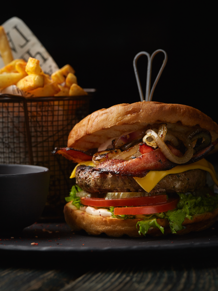 bulka, hovězí maso, chipotle majonéza, double slanina, double cheddar, salát z červené cibule a petrželky